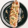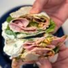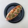 Sandwich en masa de pizza con mortadela con pistacho, stracciatella, nueces y rúcula