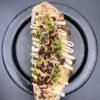 Muzzarella, salsa de gochujang con sesamo negro, pickles de cebolla, maní tostado y verdeo