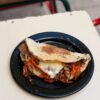 Sandwich de masa de pizza con muzzarella, roquefort, kimchi y portobellos